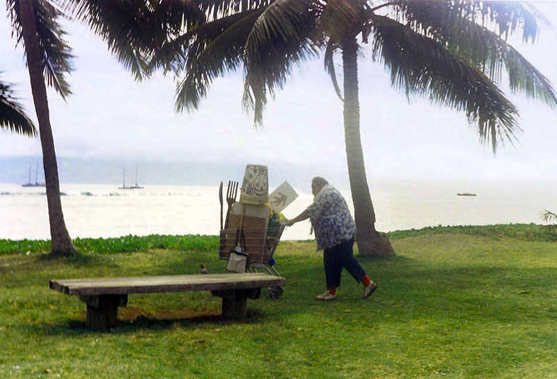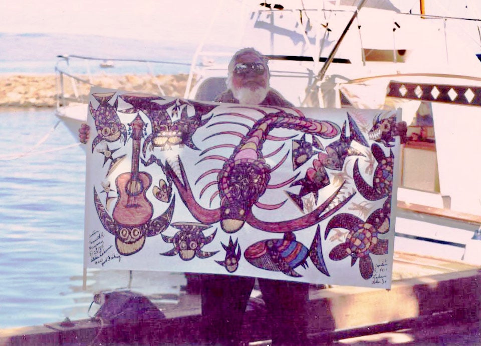 Since Captain Kenny’s passing in 2003, the legend of Maui’s notorious “outsider” artist has continued to grow. The paintings, drawings, and objects of art that he created during his illustrious career have been coveted by their original owners and have also become increasingly bought and sold by collectors in Hawaii and on the mainland. As the value of these uniquely original works of art has steadily risen over time their availability on the open market has become increasingly scarce and the opportunity just to see an original Captain Kenny creation in person these days is rare. During Captain Kenny’s heyday on the streets of Lahaina, Maui it was common to see his work hanging in homes, businesses, and restaurants. Captain Kenny’s art was part of the town’s landscape and identity and, like the artist himself, an ambassador of Maui’s spirit of Aloha. Lately it’s becoming less likely to encounter the delight of catching a glimpse of one of Captain Kenny’s whimsical, primitive, original creations on public display.